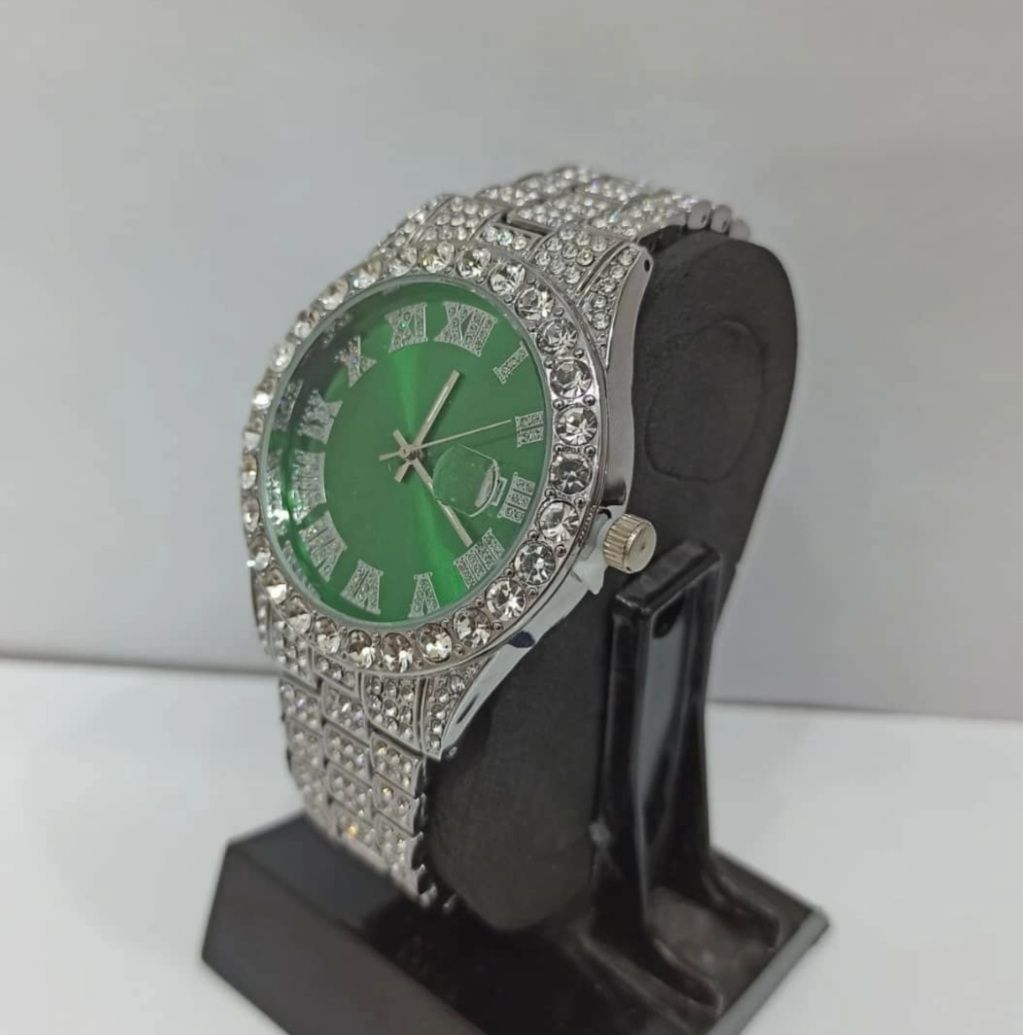 ساعت نگین دار دخترانه و پسرانه،دارای روزشمار،فول نگین،صفحه سبز،بند نقره ای