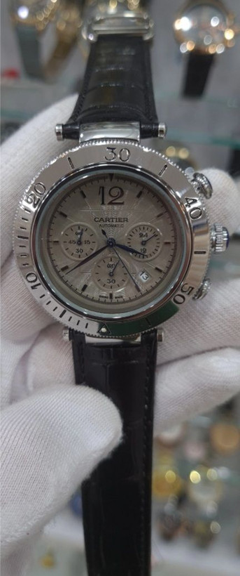 ساعت مچی مردانه ،سه موتور فعال،کرنوگراف،بند چرم مشکی صفحه نقره ای، برند Cartier