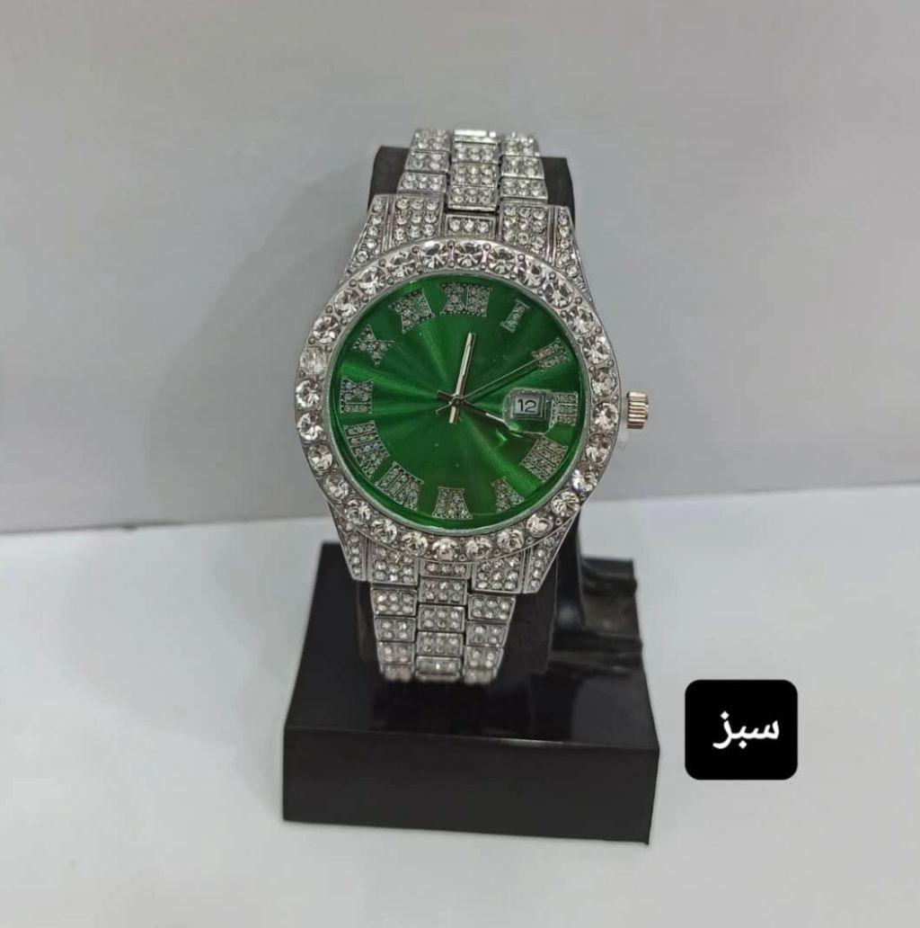 ساعت نگین دار دخترانه و پسرانه،دارای روزشمار،فول نگین،صفحه سبز،بند نقره ای